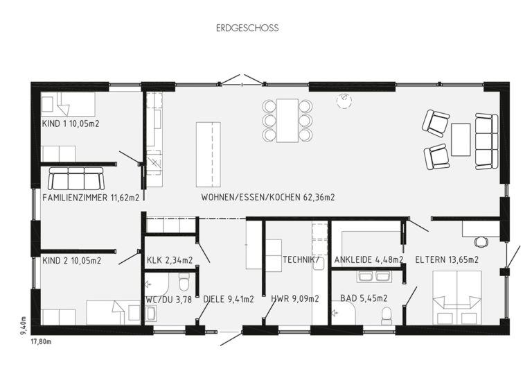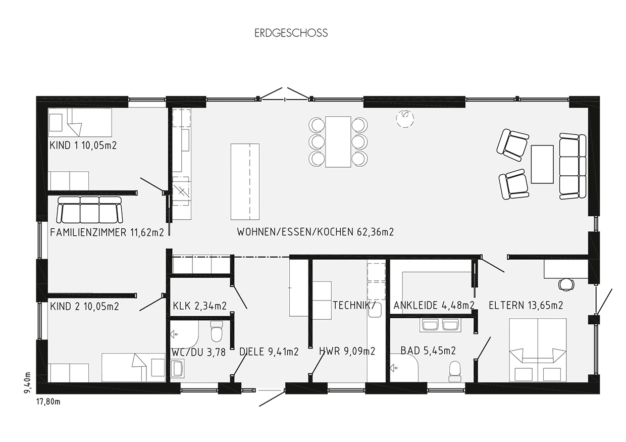 Unser Haus Ängsvik bietet auf der Gartenseite mit seinen großen Fenstern eine wunderbare Aussicht und maximalen Lichteinfall. Die Fensteranordnung auf der Eingangsseite hingegen verhindert direkte Einblicke. Ein spannendes Detail ist die leichte Neigung des Daches, die in allen Räumen des Hauses zu sehen ist. Hierdurch ergibt sich ein teilweise enormes Raumgefühl: Die Deckenhöhe über den großen Glasflächen zur Gartenseite hin beträgt über drei Meter. Im Anschluss an das Eltern- Schlafzimmer findet sich ein Ankleideraum sowie Toilette/Dusche mit Doppelwaschbecken.