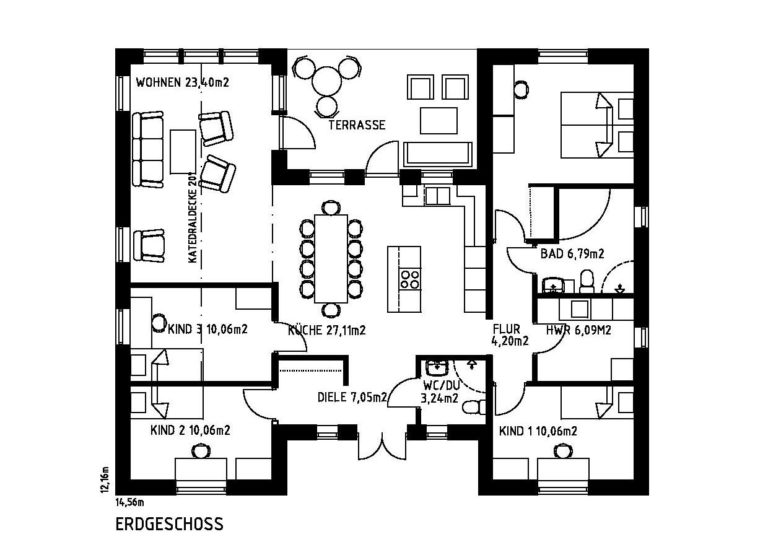 Der Grundriss unseres Hauses „Helena“ hat die Form eines H – und dies nicht nur, um mit Buchstaben zu spielen: Das Zentrum des Hauses bilden die Küche und der Essbereich. Das direkt angrenzende Wohnzimmer öffnet sich bis zum First, was zu einem großzügigen Raumgefühl beiträgt. Zwei der Schlafzimmer, der Hauswirtschaftsraum und das Badezim-mer bilden einen eigenen Gebäudeflügel, wobei sich Eltern-schlafzimmer und Badezimmer durch ein Versetzen der Türen zu einer Elternsuite zusammenfassen lassen. Der geschützt liegende Eingangs- und Terrassenbereich strahlt Gemütlichkeit aus.