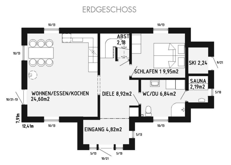 Erdgeschoss befinden sich außerdem WC/Dusche mit Sauna