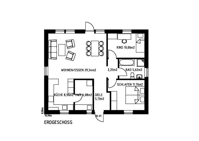 Ein Haus für die junge Familie, die auf einer Ebene wohnen möchte. Die symmetrische Fassade mit ihren ansprechenden Details weckt Erinnerungen an einen Sommerurlaub in Schweden. Komplettieren Sie das Bild durch eine optionale Veranda, auf der Ihr Morgenkaffee oder ein Glas Wein am Abend sicher doppelt so gut schmecken! Die Küche und der Wohn-/Essbereich erzeugen ein Gefühl von großzügiger Offenheit. Direkt neben der Küche befindet sich der Hauswirtschaftsraum. Die Lage des Badezimmers zwischen den Schlafzimmern gibt ein Plus an Privatsphäre.