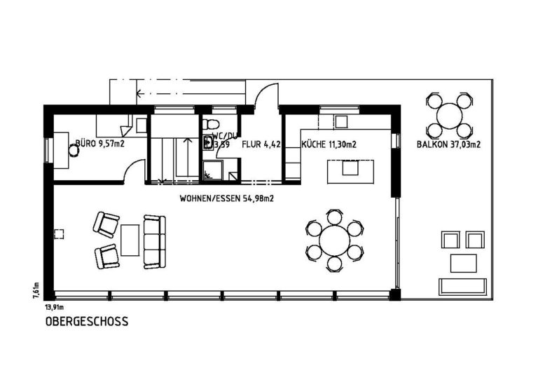 Das Wohnzimmer mit Küche ist 66 m² groß und zeichnet sich durch eine großzügige Raumhöhe und eine komplette Fensterfront aus. Zum Balkon führt eine Schiebetür.