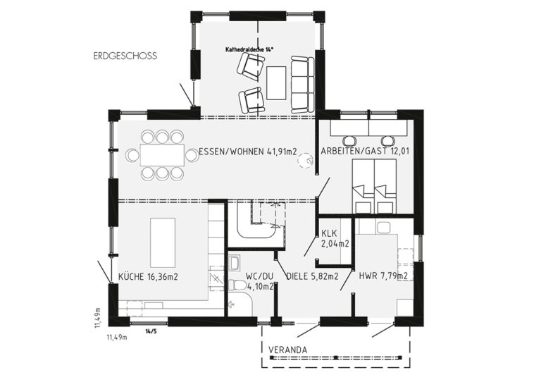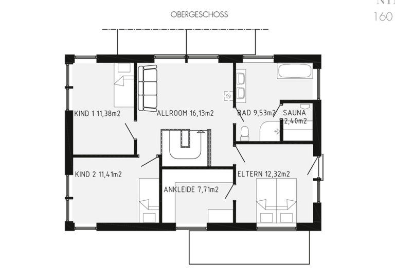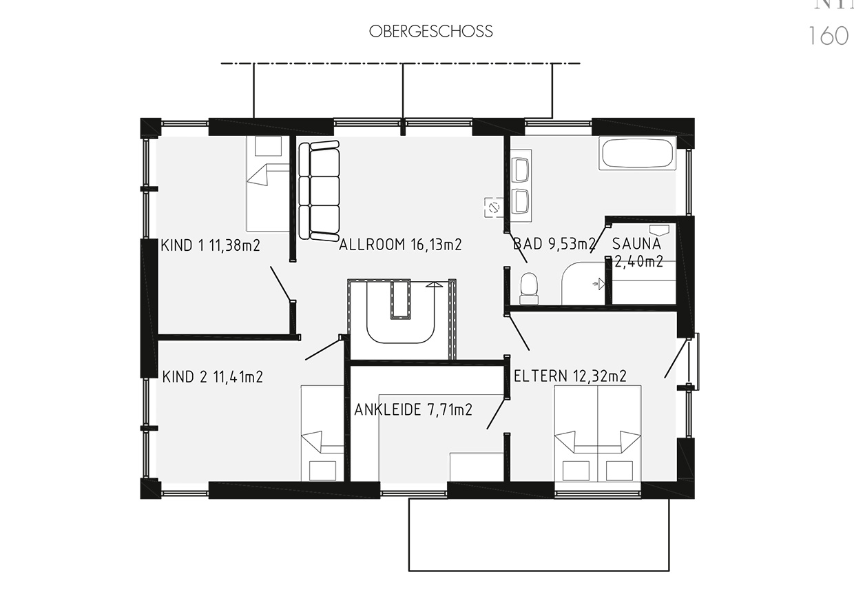Mit seinen zwei Terrassen an der Rück- und an der Giebelseite passt unser Haus „Nymölla“ auf die unterschiedlichsten Baugrundstücke. Das Haus kann mit der Längs- oder mit der Giebelseite zur Straße hin platziert und bei Bedarf auch gespiegelt werden. Sowohl Haupt- als auch Nebeneingang liegen geschützt unter dem Verandadach. Von der Diele gehen WC/Dusche, Kleiderkammer und Hauswirtschaftsraum ab. Die Wohnküche ist ungewöhnlich groß und bietet über mehrere Türen den Zugang zur Terrasse. Das in der Apsis gelegene Wohnzimmer wirkt aufgrund der Kathedraldecke extra geräumig. Auch ein Arbeits-/Gästezimmer findet sich im Erdgeschoss. Die in der Mitte des Hauses gelegene Treppe führt in den Allrum im Obergeschoss. Von diesem gehen die beiden Kinderzimmer sowie das Badezimmer mit Sauna ab. Das Elternschlafzimmer verfügt über eine großzügig geschnittene Ankleide.