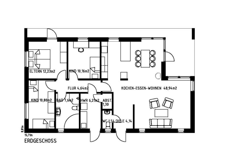 Durch die optionale Wahl von Deckenpaneele lässt sich der Holzhauscharakter noch mehr betonen. Das Haus verfügt über drei Schlafzimmer, Bad und Gäste-WC. Der Hauswirtschaftsraum mit seinem Nebeneingang verfügt über einen Abstellraum.