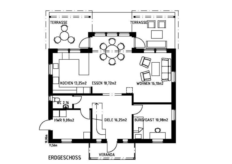 Die Eingangsveranda mit ihrem Walmdach und der Extragiebel auf der Gartenseite verleihen diesem Haus seinen eigenen Charakter. Von der geräumigen Diele gehen Gäste-/Arbeitszimmer, Gäste-WC sowie Hauswirtschaftsraum mit Nebeneingang ab.