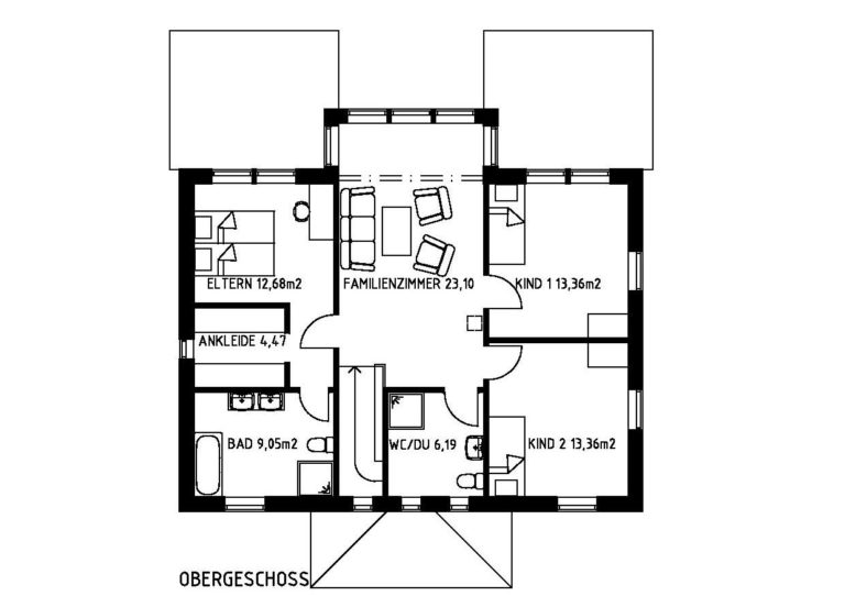Im Obergeschoss befinden sich das Familienzimmer, zwei große Kinderzimmer, Dusche/WC sowie die Elternsuite mit Schlafzimmer, Ankleide und eigenem Badezimmer.